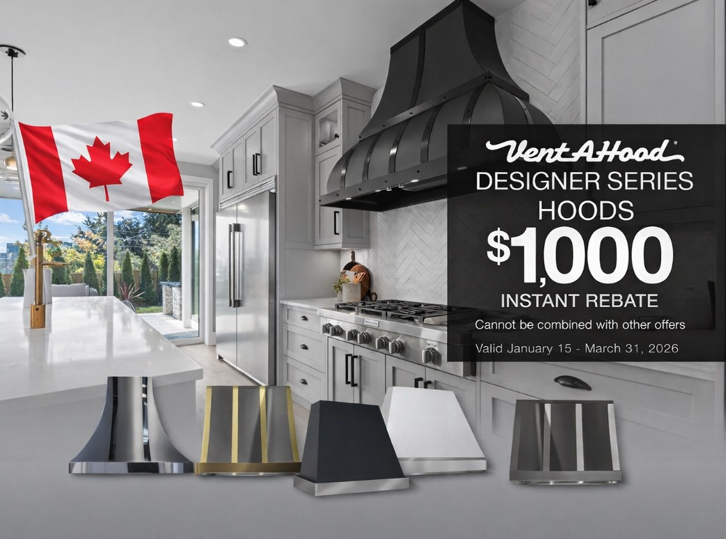 Who said that a hood can’t be designer quality? Especially when you can save $1,000 with the Vent-A-Hood Designer Series Hoods Instant Rebate from January 15 – March 31, 2026. Finish off your designer kitchen with Vent-A-Hood. Some conditions apply. Promotion is not available for online orders. Promotion cannot be combined with other Promotional offers. See in-store or contact your local Tasco Appliances for more details.