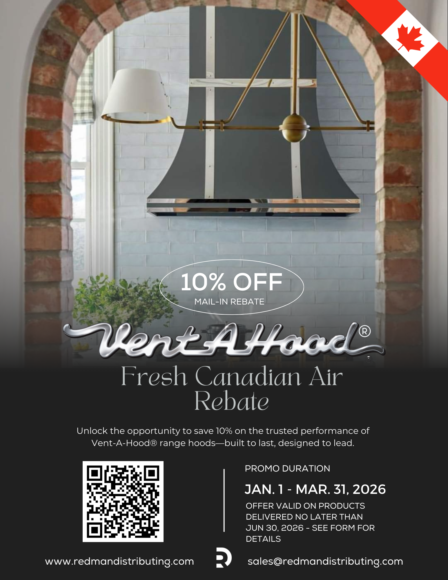 Breathe in that fresh, crisp Canadian air. Especially after you get your savings with Vent-A-Hoods Fresh Canadian Air Rebate from January 1 – March 31, 2026, unlock the opportunity to save 10% with a mail-in rebate on the trusted performance of Vent-A-Hood range hoods. Some conditions apply. Promotion cannot be combined with other promotional offers. Promotion is not eligible for online orders. See in-store or contact your local Tasco Appliances for more details.